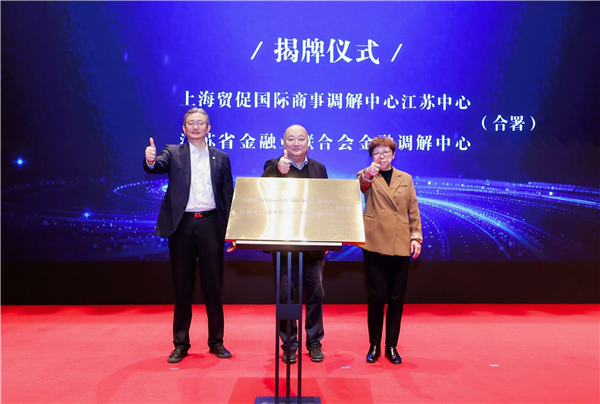 会上,上海贸促国际商事调解中心江苏中心、江苏省金融业联合会金融调解中心揭牌仪式正式举行。该中心的落地,标志着长三角商事调解资源协同、多元化解纷机制与重组纾困实现跨区域联动,将为江苏企业提供更高效、专业的商事纠纷解决服务,进一步优化江苏营商环境,助力金融生态稳健发展。