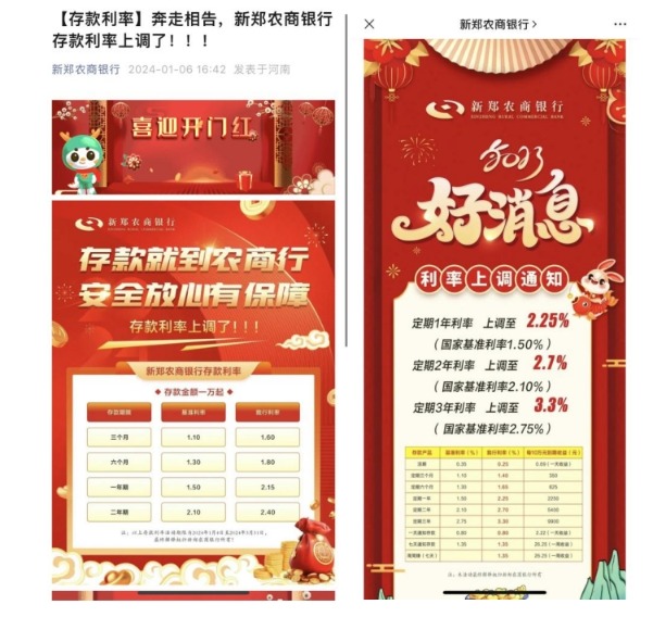 新郑农商银行2024年1月与2023年1月的利率上调公告图源:银行官方微信公众号