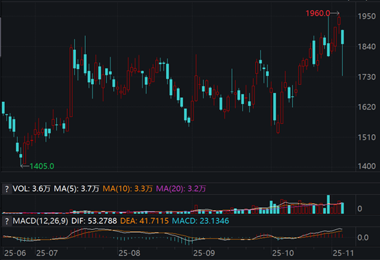 今日大跌前,集运指数(欧线月震荡上行。尽管月初受中美贸易摩擦影响,主力合约EC2512一度走低至1526点;随着局势逐渐缓和,EC2512震荡走高,月中一度走出五连阳。就在昨日,EC2512创下年内高点1960点。