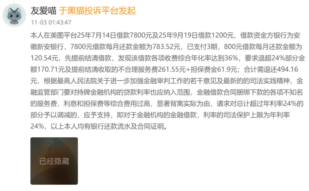 11月3日,有网友在黑猫投诉(新浪旗下消费者服务平台)反映,其2025年7月14日、9月19日先后在美图平台借款7800元(每期还款783.52元)、1200元(每期还款120.71元),借款资方为安徽新安银行,提前结清借款发现,两笔借款各项收费综合年化费率近36%。