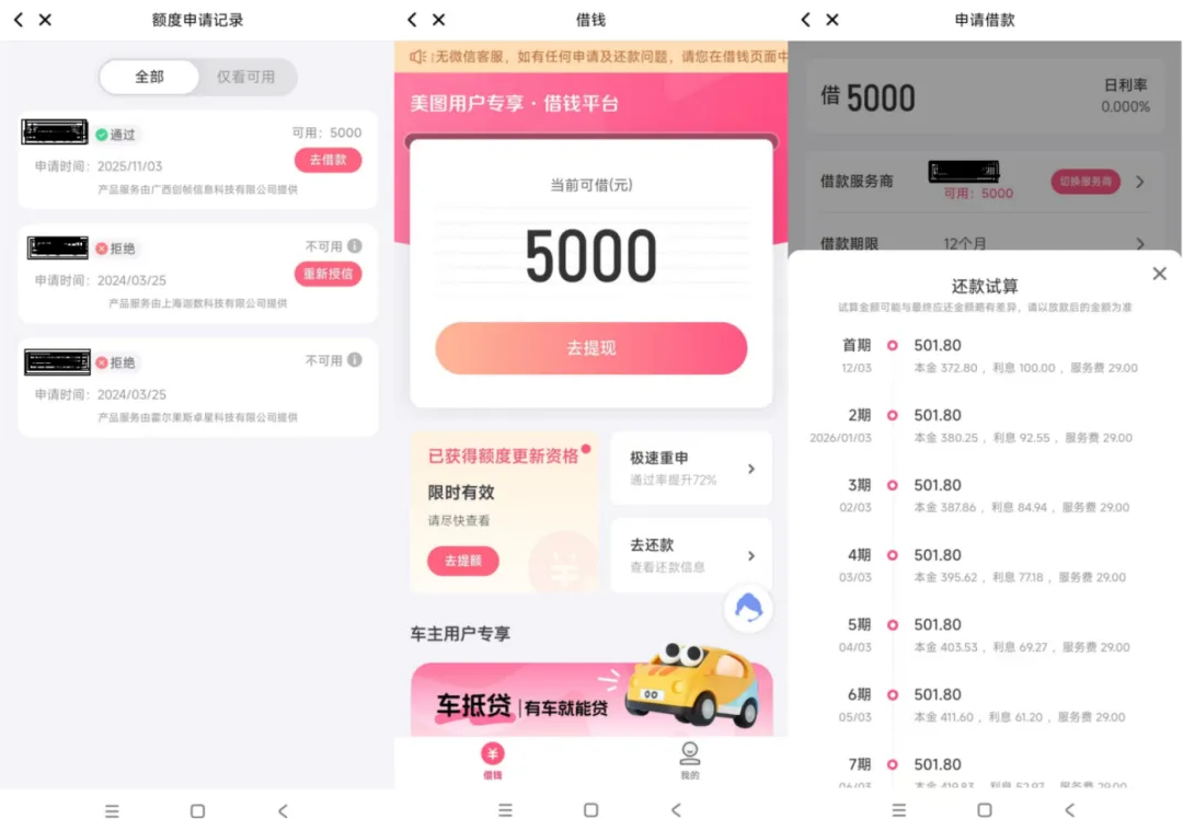 根据美图借钱页面声明,美图借钱是金融信息广告展示平台,借款服务由第三方机构提供。根据额度申请记录页面显示,曾有2家机构拒绝了小编的借款申请,2025年11月3日获得某机构的5000元额度。