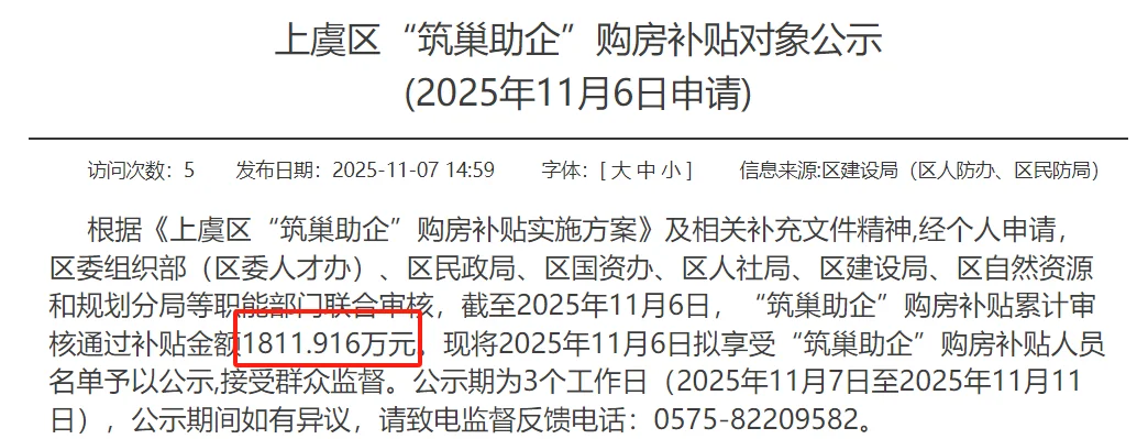 值得一提是,上虞“筑巢助企”购房补贴累计审核通过1811.916万元,剩余不到200万,即将用尽。