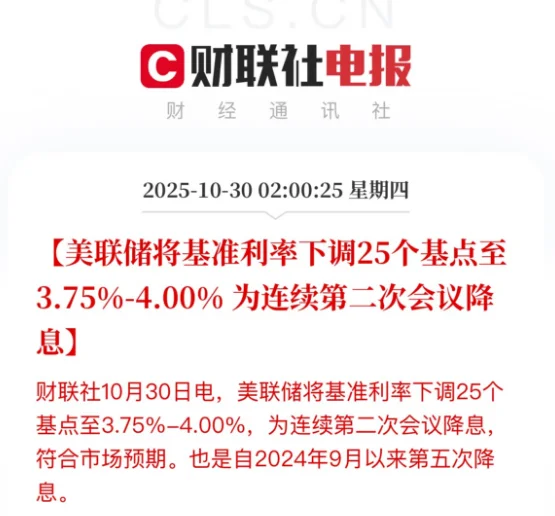 10月29日深夜,美联储宣布年内第二次降息,将联邦基金利率下调至3.75%-4.00%。这是自2024年9月以来的第五次降息,引发全球市场广泛关注。